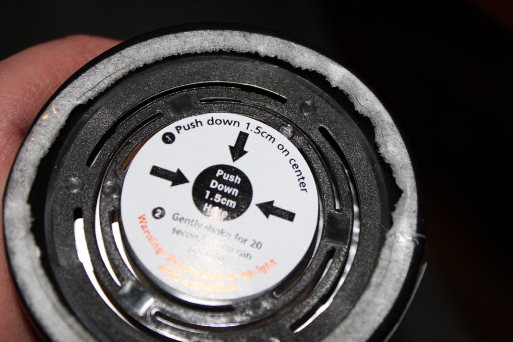 I was half tempted to whip out a ruler to ensure I was pushing the button in precisely 1.5cm, but in the end I restrained myself because I figured I wasn't strong enough to push it in too far and bollocks it up completely. As I pushed it down, it felt kind of crunchy, like when you bend a cyalume stick to make it glow. My best guess is that when you push the button down, you're releasing something that mixes with another chemical that's in there and causes an exothermic reaction. Kind of like those hand warmer things you can buy from hiking shops.
